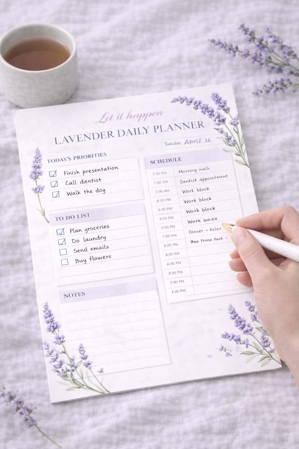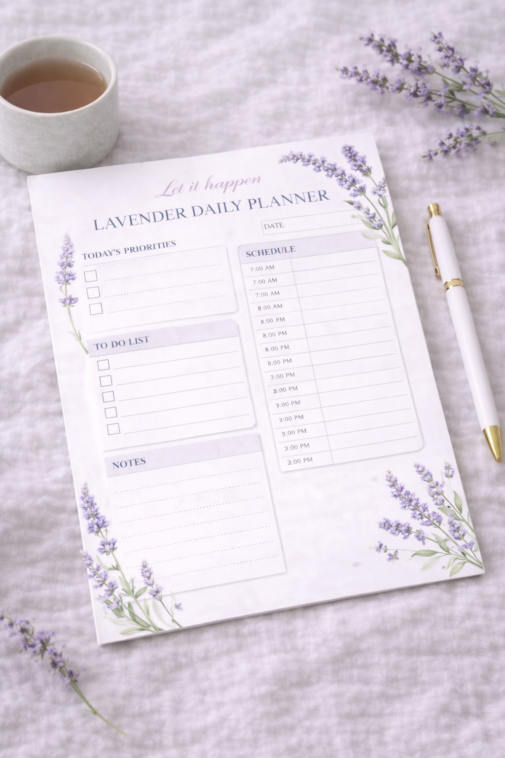 The Lavender Daily Planner is a printable daily planner with a soft floral design. Perfect for organizing tasks, priorities and daily routines.