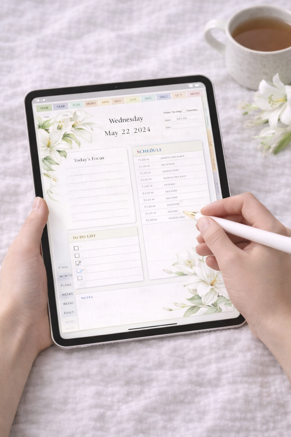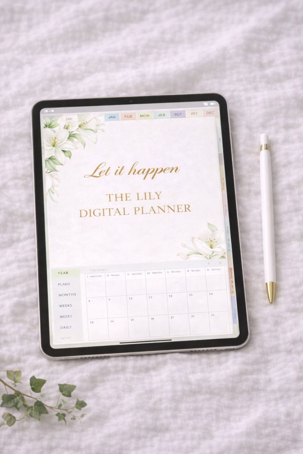 The Lily Digital Planner is an annual digital planner designed for tablets and note‑taking apps. With a soft floral aesthetic and clean layouts, it offers a calm and organized way to plan your year.